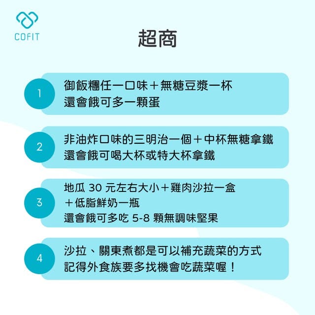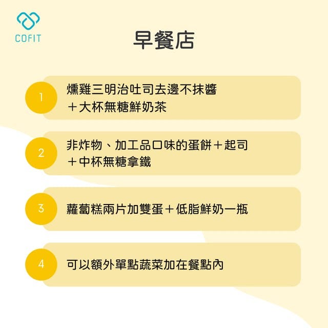 早餐店很多都可以額外單點蔬菜加在自己目前的餐點內,記得可以多應用這個技巧,讓早餐就吃到外食族最容易缺乏的一類食物!