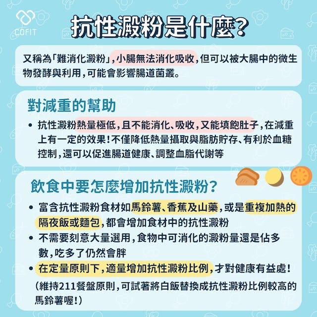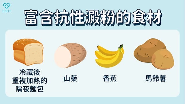 選用馬鈴薯、香蕉及山藥這類富含抗性澱粉食材,或是飯煮熟後放涼也可以使其產生回凝老化作用,產生抗性澱粉;隔夜飯、麵包冷藏後再重複加熱來吃也是一樣的作用。這些再次加熱的過程,都會增加食材裡面的抗性澱粉。但是要小心,如果因此而吃到太多量的澱粉,那對於減重可不是一件好事。