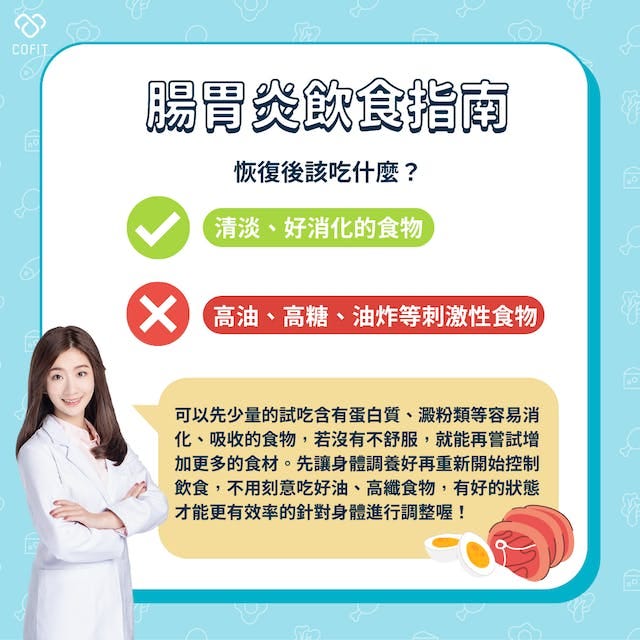 腸胃炎剛好的時候,盡量還是以清淡、好消化的食材為主,同時避免高油、高糖、油炸、奶類及咖啡因等刺激性食物。至於含有蛋白質、澱粉類這些比較容易消化吸收的食物,可以先少量試吃看看是否會造成不舒服,若沒什麼問題就能再嘗試增加更多的食材。在這段時間內,一般飲食控制中強調的多吃好油、高纖食物,可以先暫緩、不用刻意達成,先讓身體調養好再重新開始控制飲食,因為有好的狀態才能更有效率的針對身體進行調整喔!