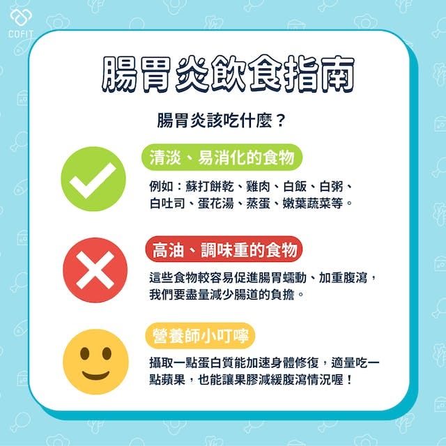 當上吐下瀉、食慾不振時,不需要勉強吃東西,有時一吃反而更影響病程。假使要吃東西也建議盡量避開高油、調味重的食物,這些食物較容易促進腸胃蠕動、加重腹瀉,而在腸胃炎期間其實需要減少腸道的負擔。像是清淡、易消化的食物就很適合這時候吃,例如:蘇打餅乾、雞肉、白飯、白粥、白吐司、蛋花湯、蒸蛋、嫩葉蔬菜等。另外也要注意不是只能吃碳水化合物,攝取一點蛋白質其實能加速身體修復,適量吃一點蘋果,也能讓果膠減緩腹瀉情況喔!