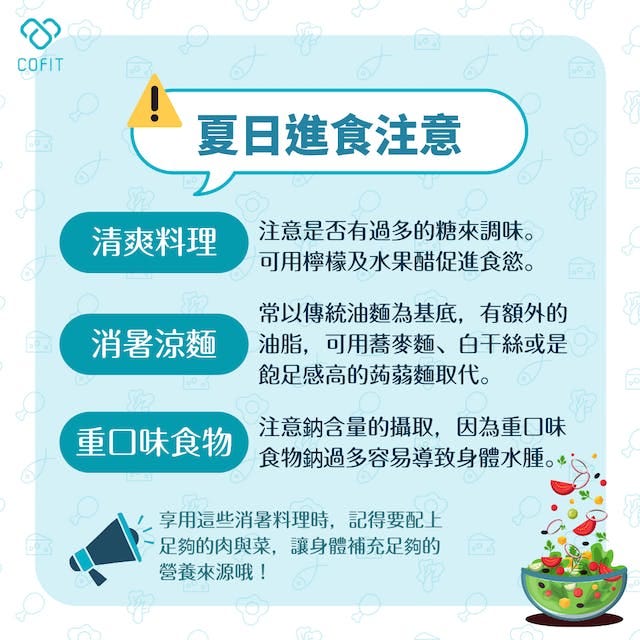 夏天常見促進食慾的方式通常為食用涼、冷這種相對清爽的料理,但這些清爽料理更要注意是否有過多的糖來調味,像是一般的涼麵通常都會使用傳統油麵,這其實就會有額外的油脂。