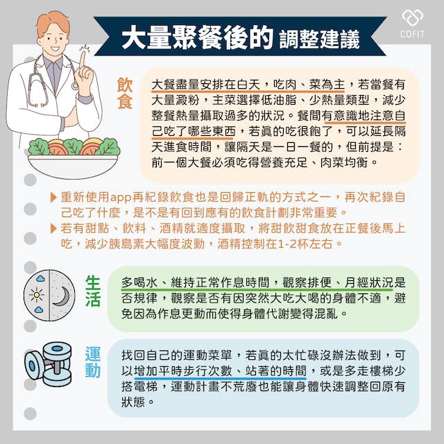 大餐盡量安排在白天,吃肉、菜為主,若當餐有大量澱粉,主菜選擇低油脂、少熱量類型,減少整餐熱量攝取過多的狀況。餐間有意識地注意自己吃了哪些東西,若真的吃很飽了,可以延長隔天進食時間,讓隔天是一日一餐的(但請注意前提是上一個大餐必須吃得營養充足、肉菜均衡。)