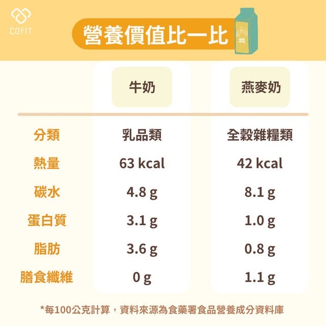 燕麥奶與牛奶是屬於兩種不同的食物分類,不可以互相取代。牛奶是乳品類,含有豐富的鈣質與優質蛋白質,但因為含有乳蛋白與乳糖的關係,不適合給牛奶過敏或者乳糖不耐受的人。而燕麥奶屬於全穀雜糧類,不含乳糖,所以對於乳糖不耐的患者可以食用,而且燕麥奶具有脂肪含量低與含有水溶性纖維等優點,但是嚴重缺乏蛋白質,主要營養素皆是碳水化合物,喝下去容易造成血糖大幅度波動,需要控制血糖者則要特別注意!