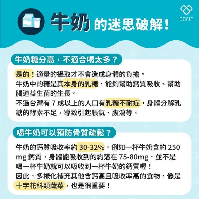 大家應該有聽過,「牛奶」好像是個超級營養的食物。根據衛生福利部膳食營養素參考原則,成人每日鈣質攝取量為1000mg,青少年則為 1200mg。牛奶除了醣類、脂肪及蛋白質之外,還有豐富的鈣及維生素B2;鈣質對於正在成長階段的小孩與擔心骨鬆的樂齡族群都是不可缺乏的。不過,我們也常常聽到不少牛奶對於人體的危害,今天就跟著營養師來破解幾個常見的迷思吧!