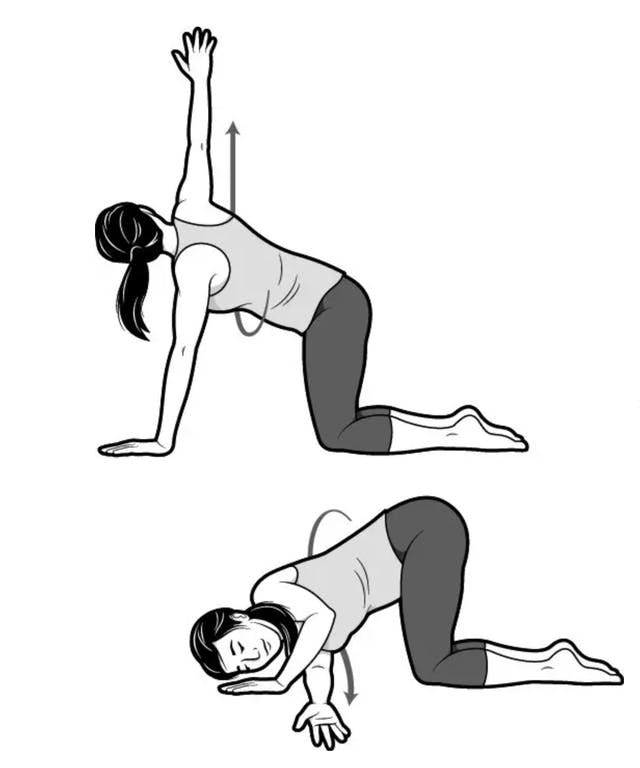 在貓牛式瑜伽姿勢之間移動可以釋放上背部和頸部的緊張感,且讓呼吸和動作同步,從而開始使身心平靜。將雙手放在肩膀下方,膝蓋放在臀部下方,當你吸氣時,背部向下並將頭抬高向上看。吐氣時將頭向下往腹部靠近,背部向上形成一個包覆狀態。在這兩個姿勢之間反覆動作,做三到五次呼吸。
