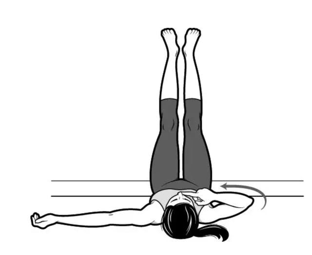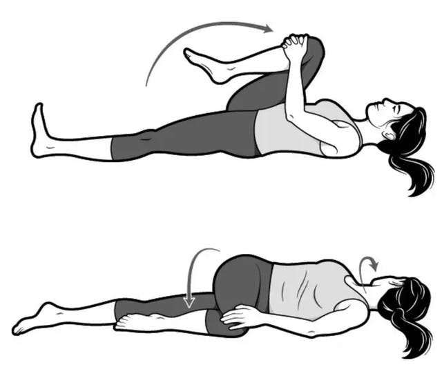這組合動作能伸展臀部和下背部。仰躺然後將右膝伸展到胸部,雙手抱住右膝蓋,伸展腰部和臀部,保持此動作做三個呼吸;鬆開膝蓋並將其轉向左腿,以進行溫和的脊柱扭轉,將視線轉向右側,保持此動作五到十次呼吸並換邊。