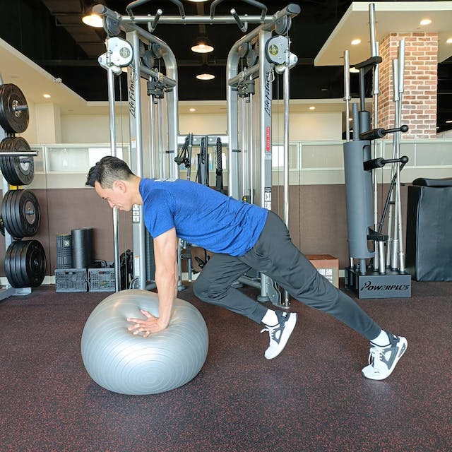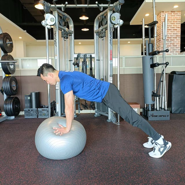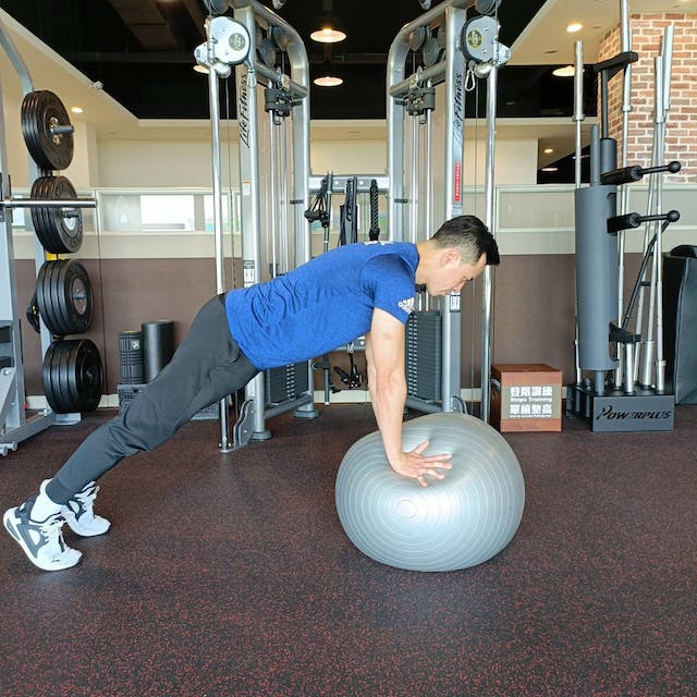 動作一:將平衡球放在地板,想像在平衡球上做伏地挺身,將雙手打直放在平衡球上,雙腳向後伸直到屁股不會過高或過低的程度。