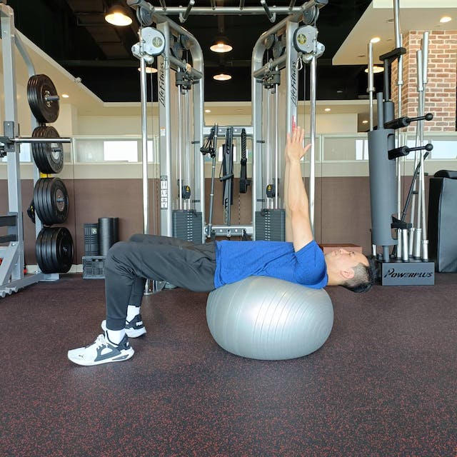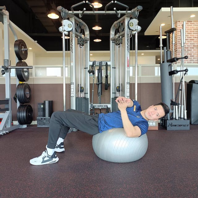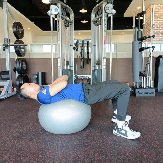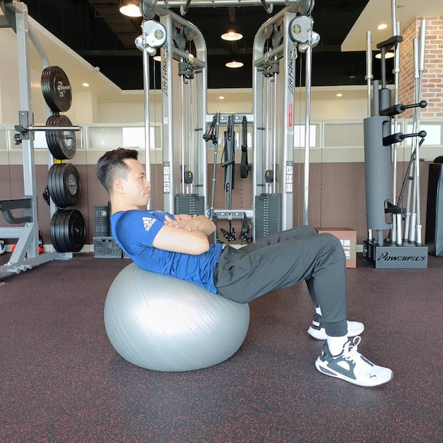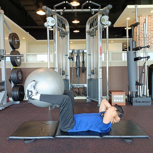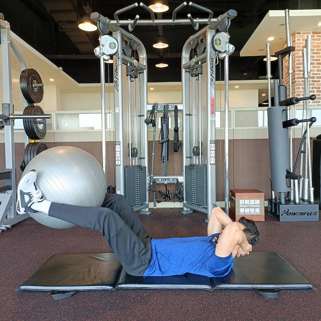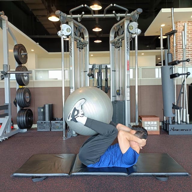 在平衡球上訓練腹部的範圍和幅度大於一般在地面上做仰臥起坐,因此負荷更高,為了增加腹部的訓練範圍,起身和回到準備姿勢時,背部要牢牢地放在平衡球上,如果平衡球的位置在背部的話會降低腹部的訓練範圍,盡量讓平衡球靠近腰部(骨盆)的位置會更有效果。每組10下,共做3組。