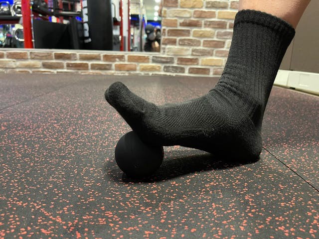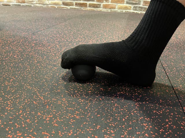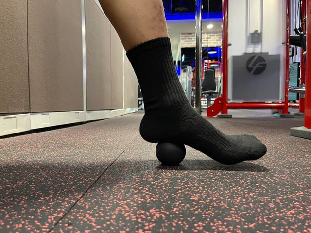 第二步:將網球推到靠近腳跟處,用單腳的體重踩在網球上頭並固定住網球,踩住20秒後即可進行下一個動作。