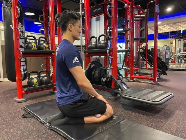 第一步:以跪姿的方式將網球放在膝蓋後方。坐下時一開始會有點痛,所以如果你的屁股有點抬起也沒關係。