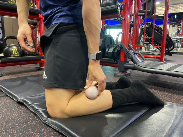 第二步:以同樣跪姿的方法,將網球移至小腿處並將屁股往下坐。