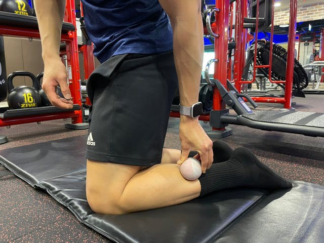 第三步:跪姿並將網球放在跟腱上方,你可選擇內側一點或外側一點,並將屁股往下坐。