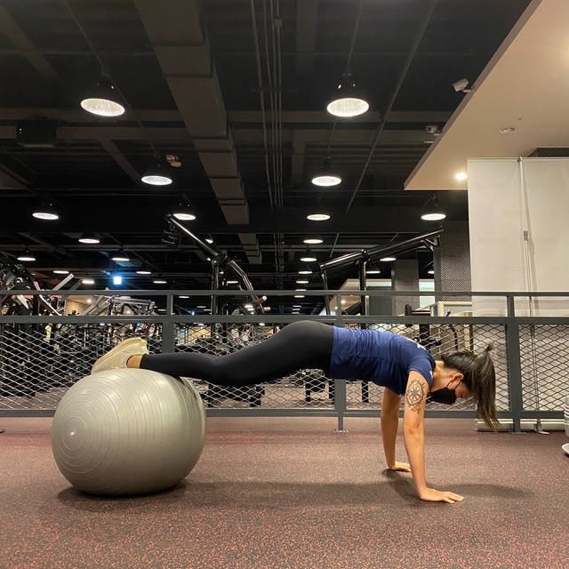 2、瑜珈球俯臥屈腿(Prone jacknife on Swiss ball)