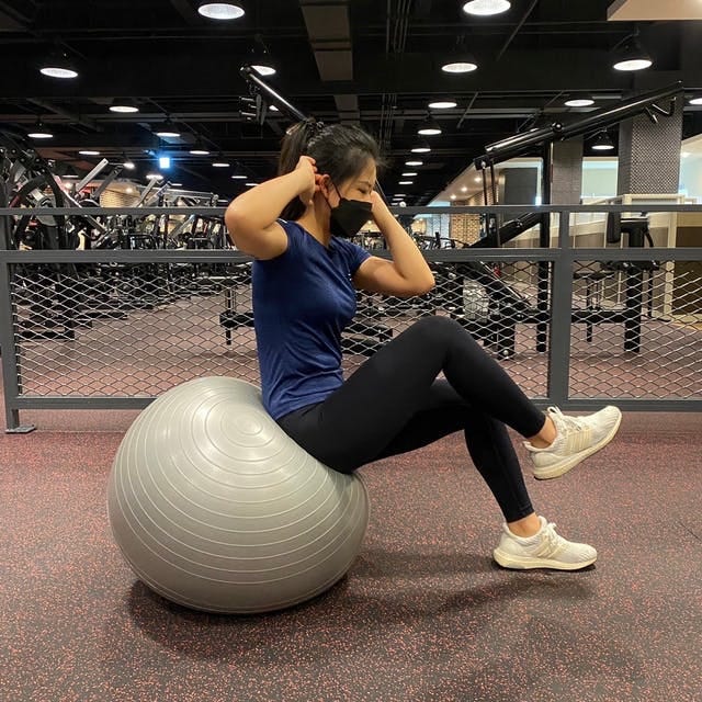 這動作主要在鍛練兩側腹肌。將身體坐在瑜珈球上方,重心放在右側臀部坐在瑜珈球的頂端,讓大腿、軀幹、頭部呈現一直線。將雙手抱胸,將身體向斜側方伸展,之後返回原位和吸氣。當右邊完成一組後,再換到左邊進行相同次數。