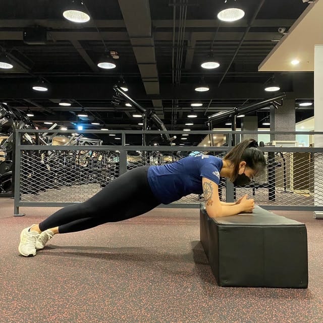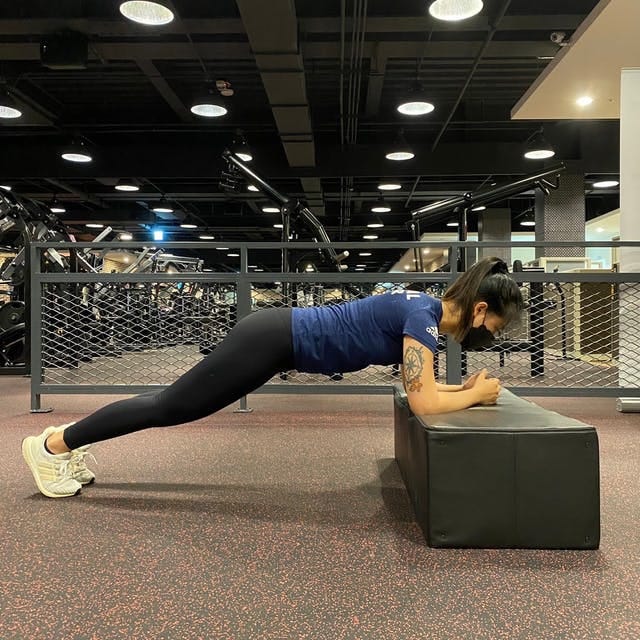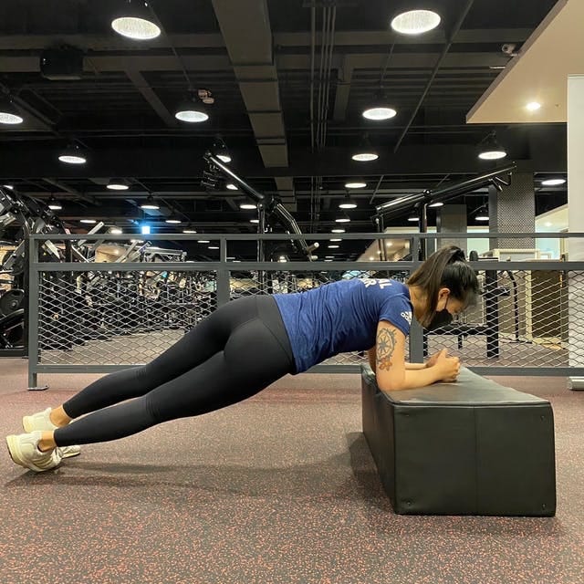讓身體進入伏地挺身的姿勢,將前臂支撐在枕頭、椅子或是桌子上。雙手向地板方向施力,用腳趾的力量抬起,再用手肘支撐來休息。讓背部保持平坦-讓頭部到腳根呈現一直線。旋轉你的骨盆並且讓腹部收縮施力,以避免在運動過程中搖晃。撐住這個姿勢20至60秒,接著回到原位休息,以進行3到5組循環為目標。