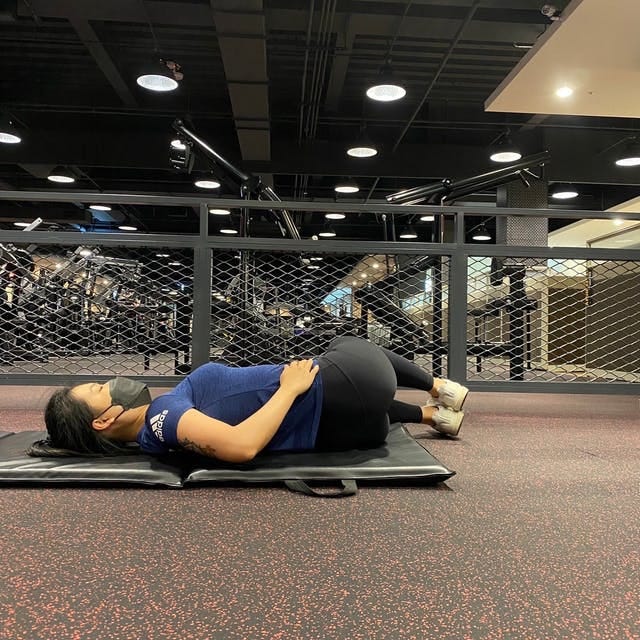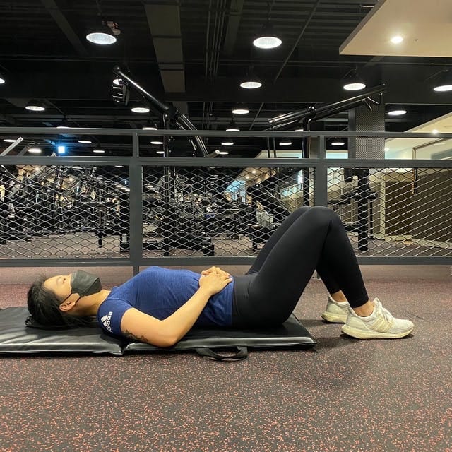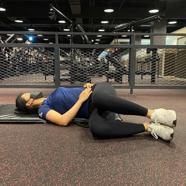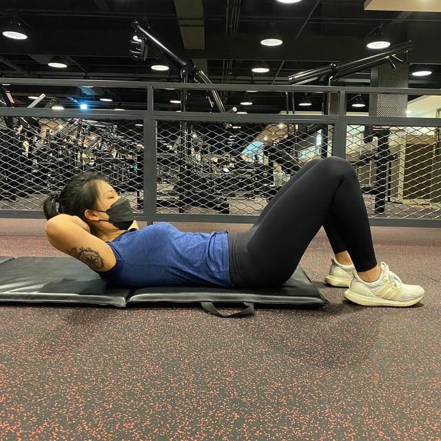 背部仰躺於地面,膝蓋彎曲並將雙腳置於地板上。拿一個後背包置於軀幹,例如在背包內放衣物、筆電來增加重量提升動作時的穩定性。將雙手扶在腦後,讓手肘自然向外。注意腹部要施力避免頸部拉傷,讓腹部向膝蓋的方向靠近,上半身自然被抬起。接著再返回原位,以12至16組為目標。